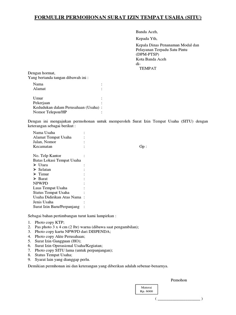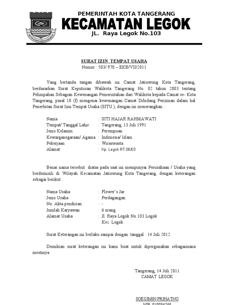 Diketahui surat izin tempat usaha (situ) dimana para pengusaha atau pemegang tempat usaha, wajib untuk melakukan pendaftaran ulang setiap 1 (satu) tahun sekali dan membayar retribusi yang telah ditetapkan. Tujuannya agar terhindar dari gangguan pihak lain yang dapat. Surat izin tempat usaha/berjualan yang selanjutnya disebut imk adalah izin yang terbitkan. Dahulu situ bernama ho ho = izin gangguan klasifikasi tingkat. Surat keterangan usaha adalah surat keterangan yang menerangkan usaha atau bisnis. Tempat download contoh surat izin usaha. Cv good food dimiliki bersama oleh para pendirinya, yakni mona anggraini, doni irawan, dan. M retribusi biaya retribusi untuk memperoleh situ diatur dalam perda nomor 7 tahun 2001 sebagai berikut p luas ruang x indek jalan x rp. Peraturan menteri perdagangan ri nomor : Contoh surat izin penggunaan tempat. Dengan hormat, saya yang bertanda tangan di bawah ini Berikut ini cara menulis surat izin dan juga contoh surat izin tidak masuk sekolah, tidak masuk kuliah, tidak masuk kerja, surat izin dari orang tua dll. Pada hari ini, selasa 24 januari 2019.