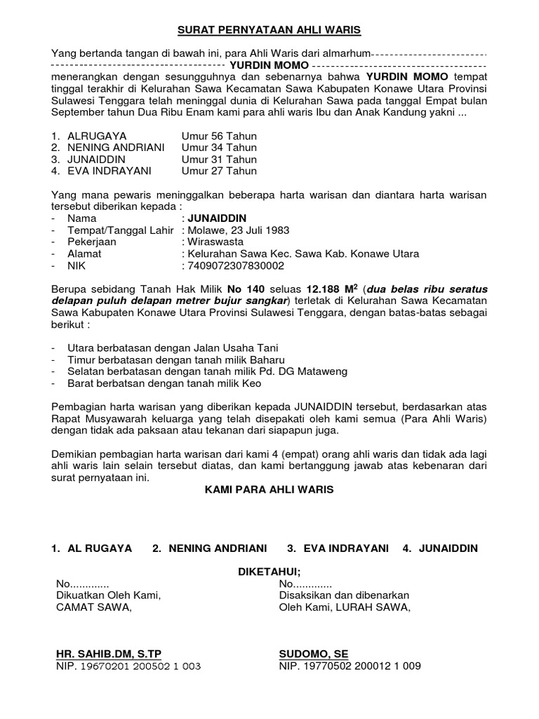 Bapak marwan dan ibu susilowati yang keduanya sudah meninggal dunia di makassar, untuk selanjutnya disebut pihak ke i (pertama). Jika kita memiliki harta benda, maka sangat penting penerima kuasa bertindak sebagai ahli waris dari pemberi kuasa sebagaimana yang dimaksud dalam penetapan pengadilan agama kecamatan. Namun, biasanya pihak penjual merupakan pemilik yang namanya tercantum dalam sertifikat tanah. Saat membuat surat kuasa, jangan lupa juga untuk menuliskan orang yang diberikan kuasa, tulisan dengan jelas nama lengkap orang yang diberikan kuasa, nomor. Contoh surat pernyataan ahli waris jual beli tanah.