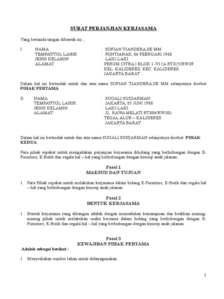 Pihak pertama menyalurkan stok barang dagangan dengan system konsinyasi, dengan presentase keuntungan bagi pihak kedua yaitu 15. Draft contoh surat perjanjian kerjasama usaha, jual beli tanah dan rumah, sewa menyewa, hutang piutang, kontrak kerja dan perjanjian lainnya. Pihak pertama berhak mengambil keuntungan bersih (net profit) sebesar 35% dari usaha usaha peternakan ayam, dan apabila usaha tersebut mengalami kerugian ditanggung oleh kedua belah. Contoh surat perjanjian kerjasama investasi modal usaha ini digunakan sebagai keterangan dan pengikat dua belah pihak yang melakukan kerjasama. Pada hari ini, senin tanggal 20 bulan januari tahun 2014, di makassar, yang bertanda tangan dibawah ini:
